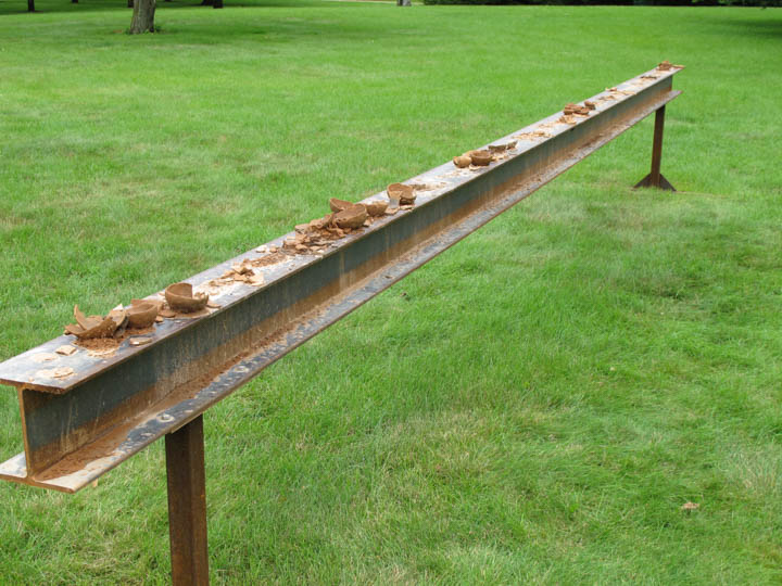 Unfired clay collected on site, 20’ steel “I” beam